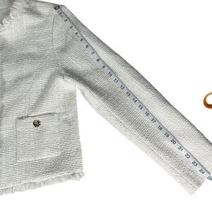 Chic, polished, and timeless — this Rachel Zoe white tweed blazer delivers effortless sophistication with its gold-tone embossed buttons and delicate fringe trim. A beautiful statement piece for the holidays, office wear, or anyone building a quiet-luxury / old-money aesthetic wardrobe.