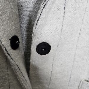 This jacket is a beautiful and soft wool viscose blend that can be styled as a long blazer or jacket. Pair it perfectly over a top, button-down shirt, or sweater. Long Sleeve Front Pockets Two Snap Button Closure Unlined 45% Wool. 45% Viscose, 10% Polyester White with black pinstripes. In great pre-loved condition! Size M.