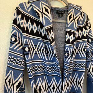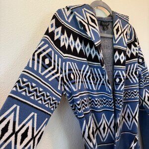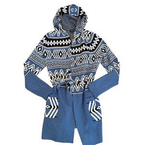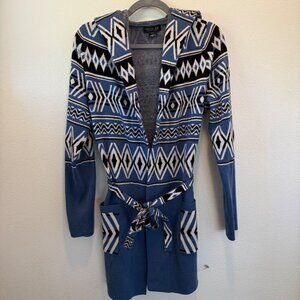 Rachel Zoe Women's Blue Aztec Print Belted Hooded Longline Cardigan Size M
