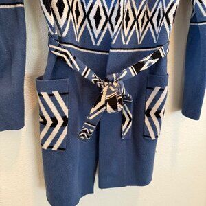 Stay stylish and cozy with this Rachel Zoe cardigan, featuring a blue Aztec print. This longline, belted design is perfect for layering and warmth.