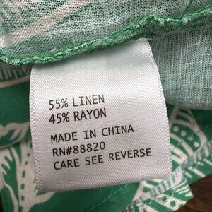Rachel Zoe Women's Green Linen Rayon Leaf Print Crop Top & Wrap Skirt Set XS. Crafted from a blend of 55% linen and 45% rayon, it offers lightweight comfort and stylish appeal. Featuring adjustable straps and a wrap skirt with a tie waist, this vibrant two-piece is perfect for warm weather. Machine washable for easy care. Made in China.