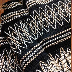 Rachel Zoe women's Small Nicolette off the shoulder dress is embroidered with ruffle hem and ruffle around the top. It is solid black on the sleeve and hem with intricated embroidered and beaded detailing/accents.