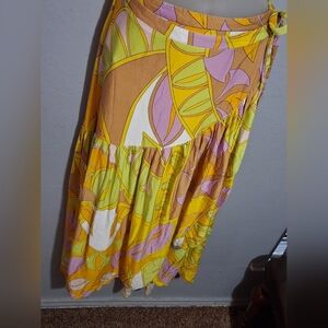 This Rachel Zoe wrap midi skirt combines elegance and comfort with its chic tie front design. The yellow and brown hues create a versatile look, perfect for casual outings or resort wear. Its lightweight fabric ensures a graceful flow, making it an ideal choice for relaxed yet stylish occasions.