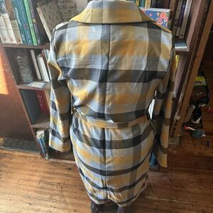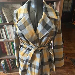 Rachel Zoe yellow and gray, plaid, tartan, unlined, lightweight, belted, classic trench coat. Pairs well with your favorite top and jeans or slacks. Gorgeous coat. Approximately 20 inches from armpit to armpit, 18 inches across the waist, and 40 inches long. From a pet and smoke free house.