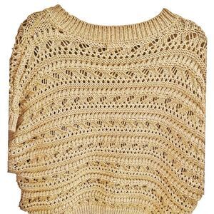 Rachel Zoe Crocheted Tan Metallic Cropped Shoet Sleeve Sweater. Size Extra large. Measures 22” P2P and is 20” long from Shoulder to hem. Polyester/Metallic. This sweater is in excellent preowned condition with minimal w. No holes,stains, or snags