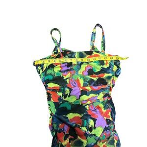 • Sleeveless, square, bodycon silhouette, floral motif, graphic print, tropical print, paint splatter print, print, green, mini