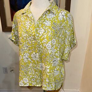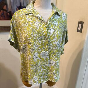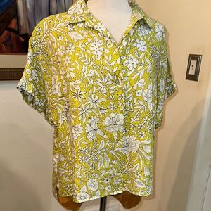 Rachel Ashwell Lime/ Yellow Floral 100% LINEN Boxy Button Down Shirt MEDIUM