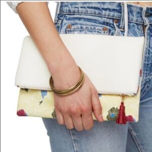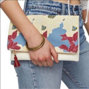 Beautiful Rachel Pally fold over clutch bag. Floral print on one side and cream on the other. Maroon color tassel on the zipper. Gold hardware. 10 x 7 when folded. Like new. Never used. One small smudge on the corner on the cream side. Can be folded either way for two different looks!