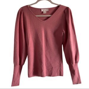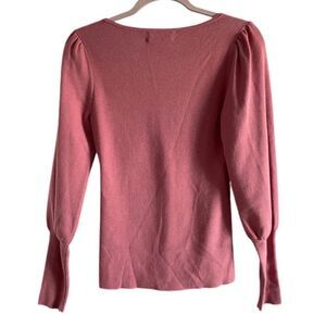 Lightweight blush pink colored sweater knit from fine-gauge yarns. Feminine scoop neckline. Juliet sleeves.