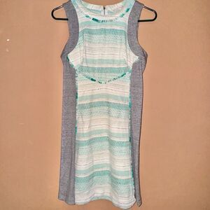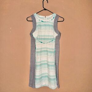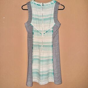 The dress features a unique beach aquamarine/white design with grey sides and a zip back closure. It is made from a cotton/poly blend and is in great condition, barely worn.
