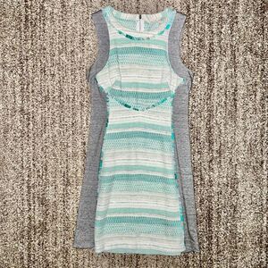 Color is grey on sides, woven beach aquamarine/white design, zip back, tank, super stylish and comfy, cotton/poly blend
