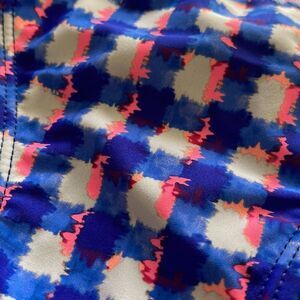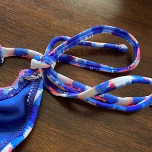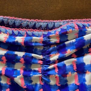 Hess swimsuit bottoms are too gorg! They are a beautiful shade of blue with a touch of pink and red through out. They are adjustable on the sides with strings that you can tie. The back of the bottoms are ruched. The top of the bottoms have a beautiful string detail. 10” from hip to hip in the front and 13” across the back