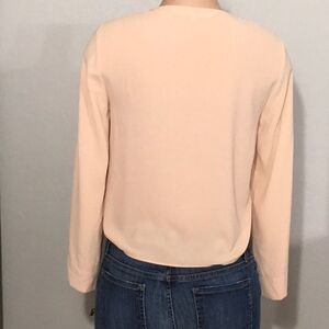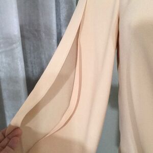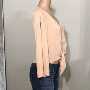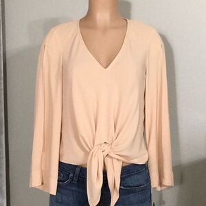 I love the color of the top. It looks so beautiful on your skin. The bell sleeves have a long slit on each side. Very pretty and sexy. Ties at the bottom in the front. V-neck crape fabric. The tag is a partial tag only.