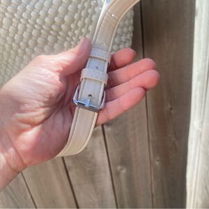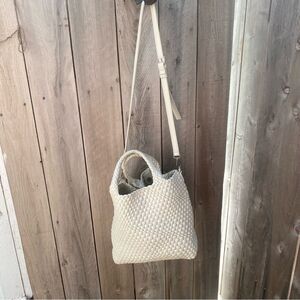 This Rachel Zoe tote bag in a soft cream color features a sophisticated basket-weave pattern, offering a chic and minimalist design. Cratted with attention to detail, it provides ample space for your essentials, making it a versatile choice for both everyday use and special occasions. The elegant texture and neutral tone ensure it complements any outfit effortlessly.