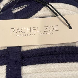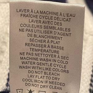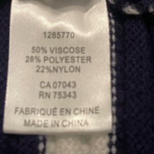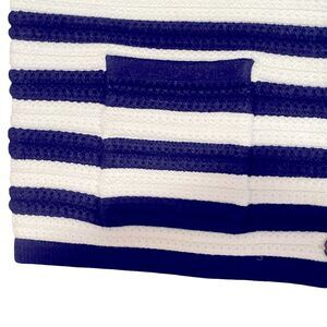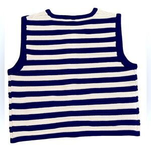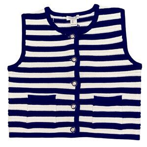 Chic knit vest with navy and white pattern. Features button closure and front pockets.