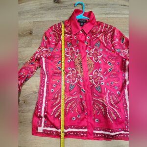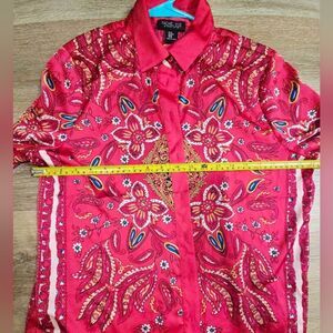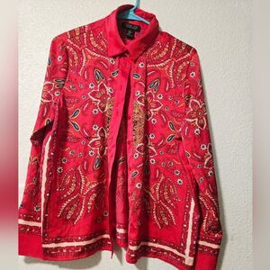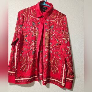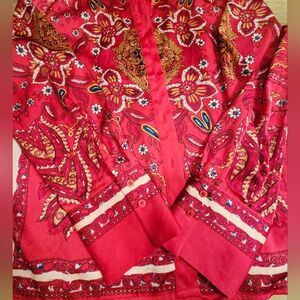 Bold red blouse with intricate paisley pattern. Perfect for a standout style.