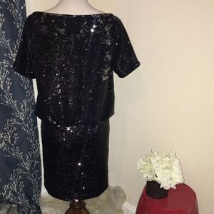 Good, preloved condition. Rachel Zoe Sequin Blouson Dress. Short sleeves. Bateau neckline. Reversible flip black silver sequins. Holiday, party, cocktail, event.