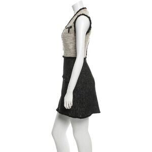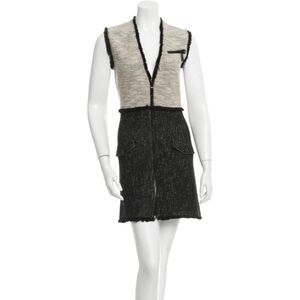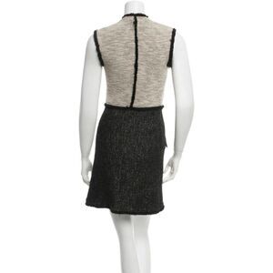 Beige and black Rachel Zoe sleeveless bouclé dress with raw-edge trim throughout, zip pocket at bust, slit pockets at hip and exposed black zip closure at center front.