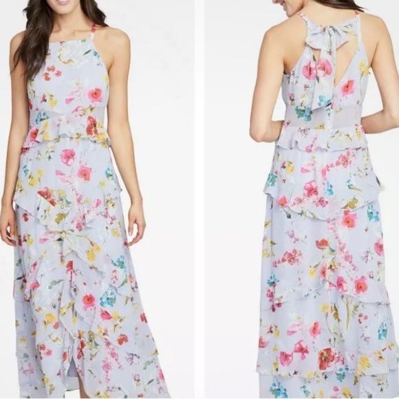 Rachelle Roy floral maxi dress with ruffles tie bow at neck, semi sheer at waist sexy opening at front, lined