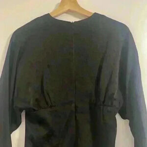 Racil Vintage style leopard jacquard ruched long sleeve black blouse Top features deep V-neck, kimono style bracelet length sleeves, gathered waistline and gathered under bust seam, covered back zipper closure, black decorative buttons at front Material: 60% viscose 40% polyester Retail price $407.