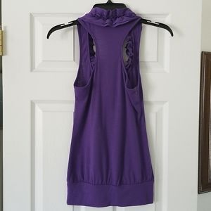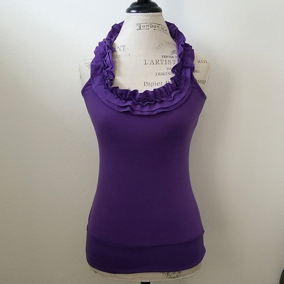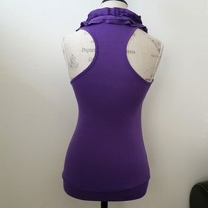 Comfortable purple rackerback tank top with ruffles on the collar. Great for a night out or casual dress up of your outfit.