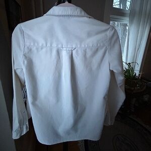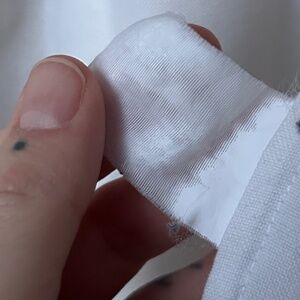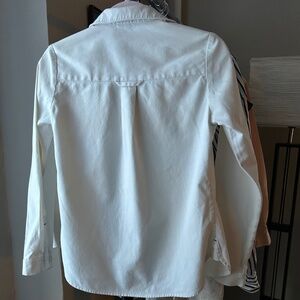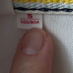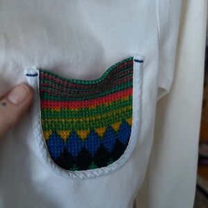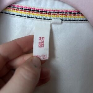 This shirt is steeped in cool. Super unique details. Incredibly great quality - 100% cotton I'd guess...inner tag is fully faded (see pic). Thicker, durable material that shows in the way it fits. Definitely an XS though. Does not always fit my 32DD chest very well, and the biceps can be a bit tight - my arms aren't that big. So, definitely for a petite bodied individual! If you wear XXS or normally shop petites, this is for you! Can't figure out the brand - lemme know if you can tell where it's from! Some slight discoloration that could probably be treated - reflected in the price.