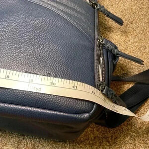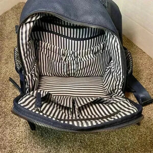 Rad/Rev Navy Blue Backpack Diaper Bag. Lining is blue and whole striped. 2 zippered pockets inside along with 8 other compartments. Pockets on each side that expand. Zippered pockets on outside front along with an open pocket on front and back. All zippers function. In excellent condition.
