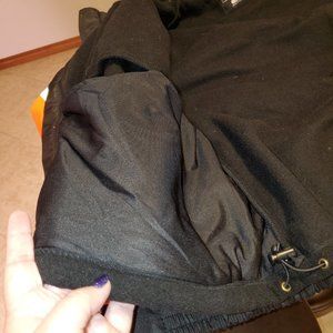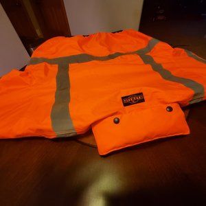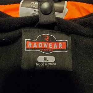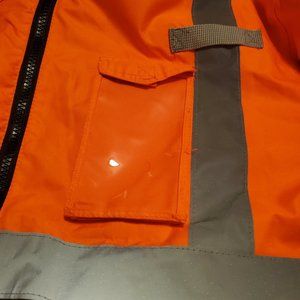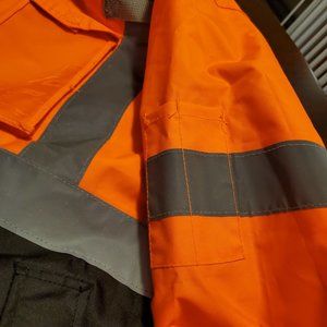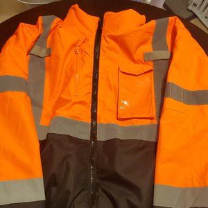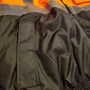 Radians SJ210B Three-in-One Deluxe Bomber Jacket with black bottom has a zip out fleece jacket, concealed attached hood, elasticized waistband and several inner and outer pockets. Safety jacket has 2" silver reflective tape for high visibility. This thing has SO many secret pockets! It is SUPER reflective and very warm. Only worn once. No signs of wear. This will definitely make sure that you are visible to heavy equipment and vehicles. Pictures show how reflective the stripes are with the flash. Size XL men... would also fit about a size 2X woman.