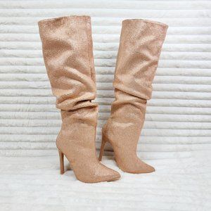 Radiant Beige Rhinestone High Heel Slouch Knee High Boots
