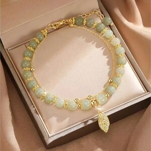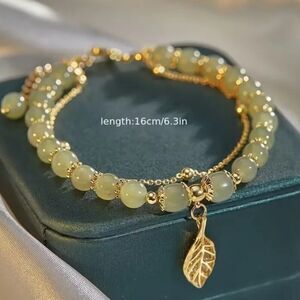Radiant Double-Layer Green Beaded Bracelet with Sparkling Golden Leaf Charm