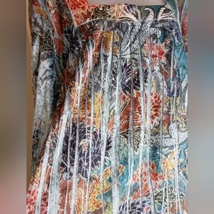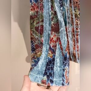 This top shows an elaborate, vibrant garment that captures attention with its rich tapestry of colors and intricate patterns. The fabric appears is lightweight velvet.