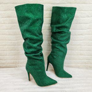 Radiant Emerald Green Rhinestone High Heel Slouch Knee High Boots