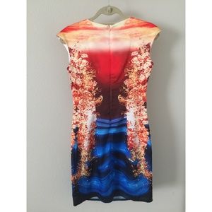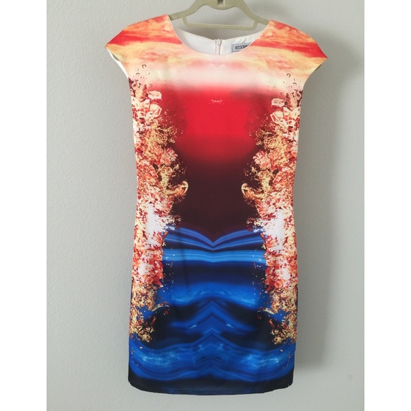 This is a one of a kind cap sleeve, crew neck, sheath dress. The colors are stunning and the engineered print is mirrored and perfectly symmetrical. I purchased this when traveling in Hong Kong in the Fashion District and fits wonderfuly like a size small.