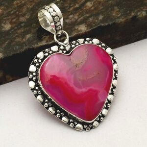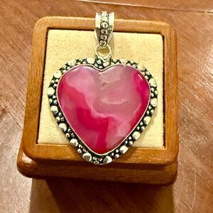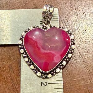 Turn heads with this stunning heart-shaped pink solar agate pendant, a piece that blends natural elegance with artisan craftsmanship. The swirling hues of magenta and blush pink are framed in a detailed sterling silver bezel, accented with delicate beading that adds texture and charm. Suspended from a sleek silver snake chain, this pendant rests gracefully at the collarbone—perfect for everyday wear or special occasions.