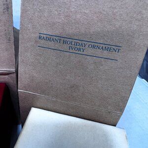 Angel ornament has a pearl and delicate wire design. Ruby and ivory ornaments have minor box scuffs.