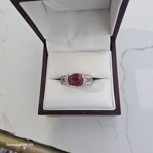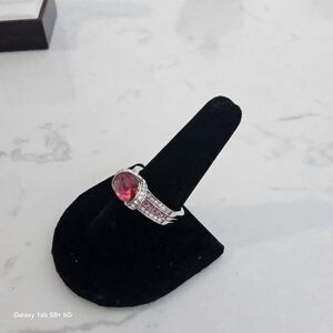Features A Stunning 2.80 Carat Pink Sapphire Surrounded By Sparkling White Topaz Stones That Add A Touch Of Glamour To The Design. Made Of High-quality Brass Plated With Rhodium. Band Measures 4.5mm. Believed To Be Simulated Gemstones