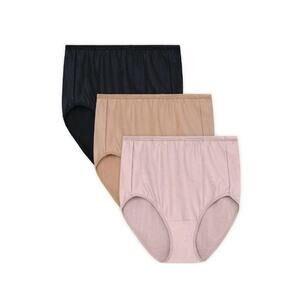 The Radiant Vanity Fair 3-Pack Undershapers Hi-Cut Comfort Stretch Panties in size 4XL are designed for everyday wear. Made from a comfortable nylon/spandex blend fabric, these solid-colored panties feature a high-rise waist with a comfortable elastic waistband. The brief style and tagless design ensure a lightweight and stretchy fit, while the high leg cut adds a touch of elegance. These machine washable panties come in a pack of three, making them a practical and stylish addition to any woman's underwear collection.