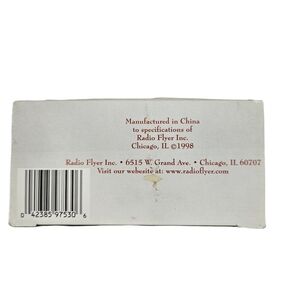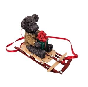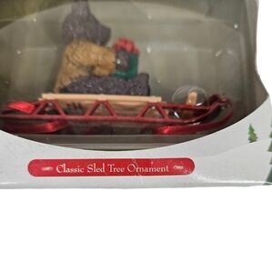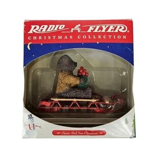 Features radio flyer Christmas collection model 110 Christmas tree ornament, brown bear sitting on radio flyer sled with a gift, red ribbon hanger, includes box and plastic storage holder.