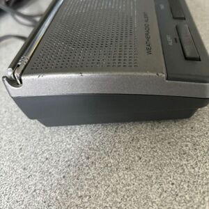 Radio Shack Weatheradio Alert Model No. 12-240. Tested and works! Batteries not included. Very top portion of antenna is missing, top is slightly bent.