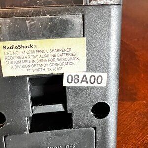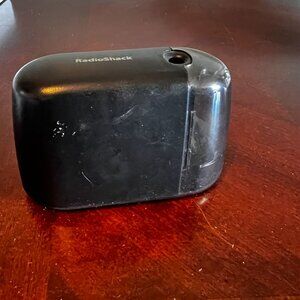 keywords: electric pencil sharpener, battery pencil sharpener, compact desk tool, classroom supplies, portable sharpener, RadioShack sharpener, office supplies, pencil sharpener tool, black pencil sharpener, single-hole sharpener, durable plastic sharpener, desktop sharpener, pencil sharpening tool