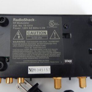 The RadioShack RF Modulator is a versatile unit that can convert video signals for transmission through coaxial cables. With a connection split/duplication of 1:5, this black-colored converter is ideal for distributing video signals from a single source to multiple devices. Made in China, this RF modulator is a reliable and efficient accessory for your TV and video setup.