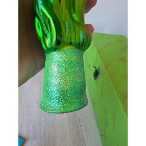 overall good condition looks like it's a little bit of glitter wear at the base, otherwise in good condition, no significant problems, 11 in tall by 5 inch by 4 in, one small aged spot and a little cracking at the base of the grass as well noted in last picture, mild damage on the box