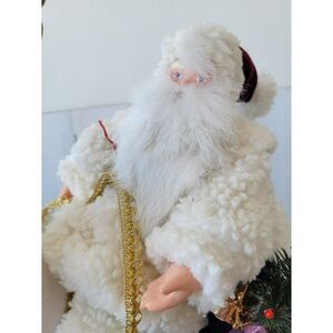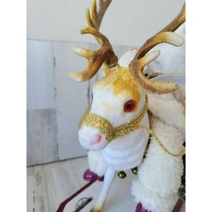 stands about 19 in tall by 18 by 8, front wheel is damaged, could be an easy fit fix missing part of the wheel but could be redone, antlers were broken off but could also be repaired very easily, otherwise in great condition, no box, White is in great condition, no problems, there is one small paint damage on the left foot of Santa