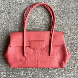 Spring is coming! This Radley London pebbled leather shoulder bag in coral pink is a great spring piece. Very clean inside except for three minor marks (pen?—see photos) The exterior is in great condition except for a slight mark in the back of the bag (see photo) and what appears to be a slight mark on the front but is barely discernible. Two zippered pouches inside as well as organizing compartments sewn in. Approximately 15” x 9” not including leather straps. SFPF.