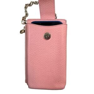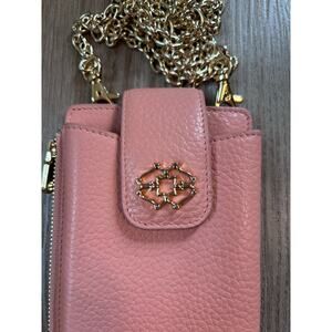 This beautiful leather phone holder and wallet is brand new without tags from a clean, smoke-free home. Features magnetic flap closure, removable chain for a horizontal or vertical fit, zippered, compartment, and five card slots. Picture with an iPhone 15 in a case, which is a perfect fit with plenty of room to spare. light, orange peach, color with gold hardware and chain.