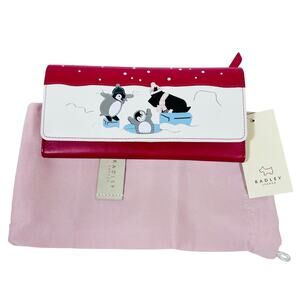 Introducing a Radley London Hole Lotta Fun Wallet in large size, crafted from white and red leather with an adorable design featuring penguins and the iconic Scottie dog. This wallet is brand new and perfect for adding a whimsical touch to your everyday essentials.