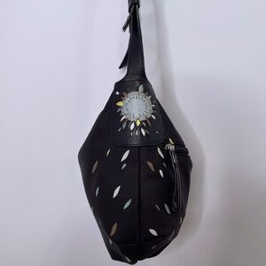 black with blue, brown, yellow abstract print on side with what appears to be leather cut-out design on the sides.