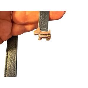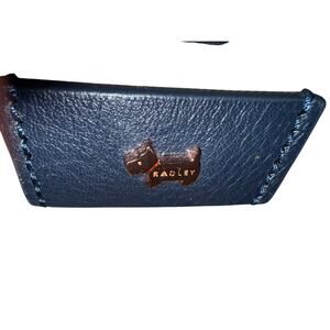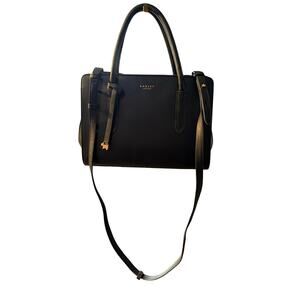 Bradley of London Arlington Heights handbag is new without tags in excellent condition. It’s navy blue leather with the signature Bradley Scotty logo and hang tag. The only callout is one small black spot on the interior fabric. The outside is pristine. The interior has a center zip packet that opens to reveal a rear zip pocket and two front slip pockets. There are two larger compartments on the front in the back of the bag and there is a smaller exterior slip pocket in the back that will fit a phone. The interior is a beige leather and the hardware is rose gold.