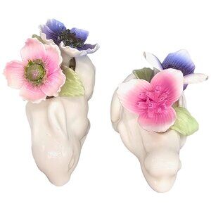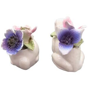 These exquisite Radnor Bone China figurines depict a rabbit and a frog, each adorned with delicately crafted flowers in hues of pink, purple, and green. The fine workmanship and vibrant colors highlight the beauty of nature, bringing a touch of elegance and charm to any collection or decor setting.