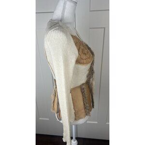 The sweater is cream and caramel in color, slight loose weave with thin gold lurex accent running throughout. This sweater would be amazing paired with wide leg pants for holiday parties! Truly art to wear!